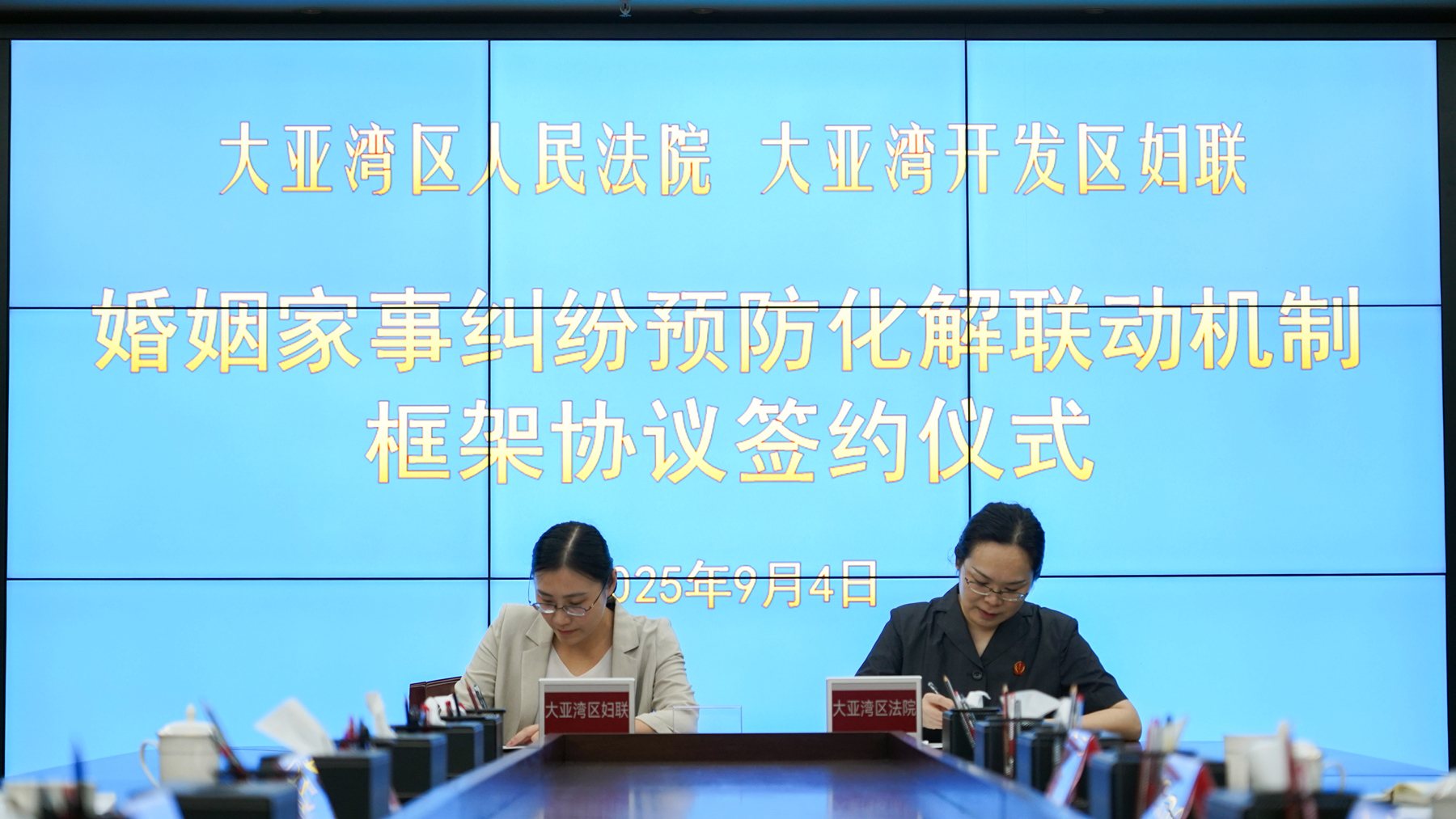 9月4日上午,大亚湾经济技术开发区人民法院与大亚湾开发区妇女联合会共同签署《婚姻家事纠纷预防化解联动机制框架协议》,同步为“家庭教育指导工作站”揭牌,并召开妇女儿童权益?;び爰沂律笈辛嵋椋?ldquo;司法+妇联”协同之力,为辖区家庭和谐与妇女儿童权益织密温暖守护网。