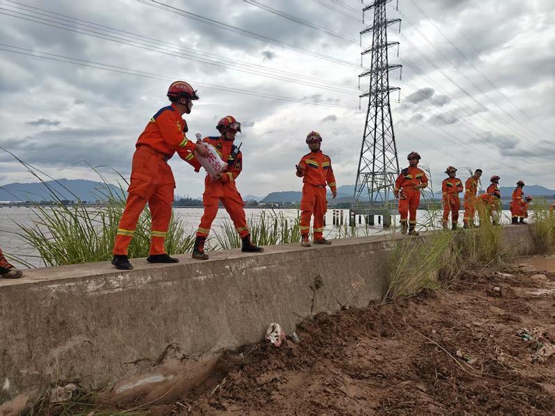 大亚湾消防救援大队消防队员采用沙袋堆叠方式对石化园区开展堤坝加固作业。