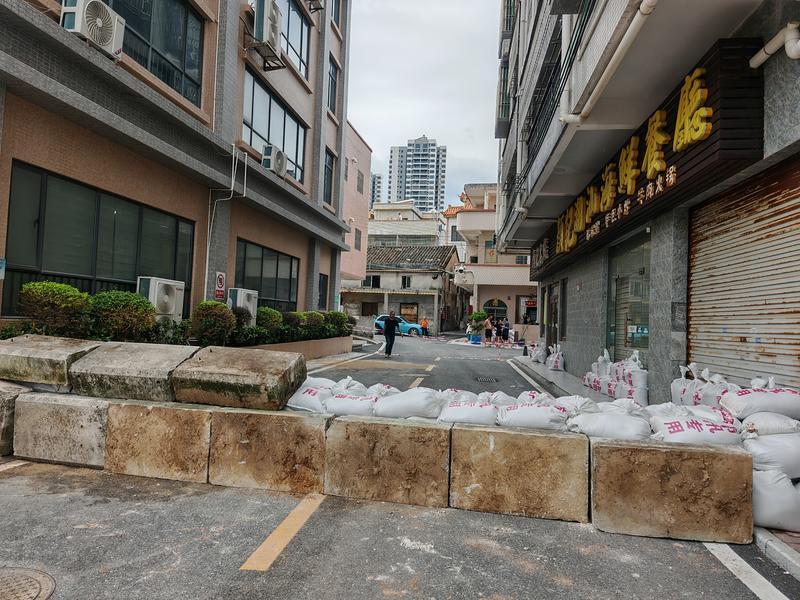 23日中午,在大亚湾霞涌街道海边的霞新村,从海边进村的主干道已用沙袋筑起一道防汛堤坝,海边堤坝外围也设好警戒线,防止村民和游客靠近海岸。村民也通过各种方式防范台风,在家门口堆起沙袋,仔细检查家中门窗是否牢固,提前储备好生活物资和应急用品。